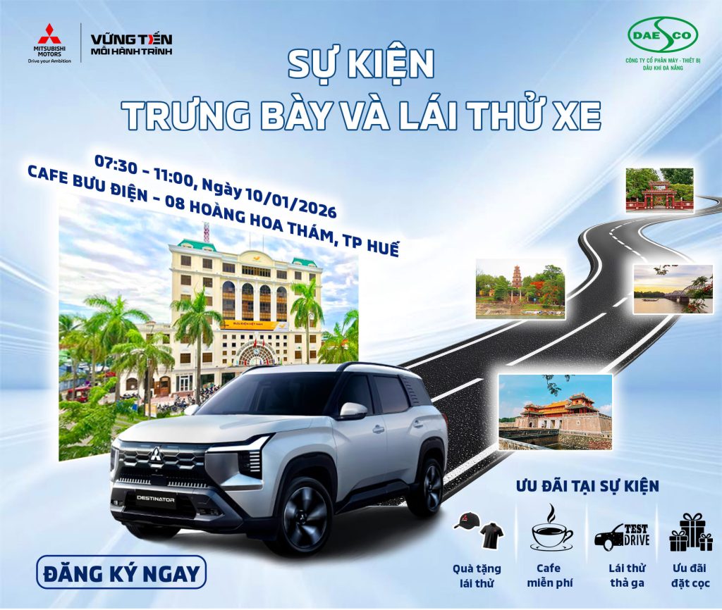 Mitsubishi Daesco Huế trân trọng kính mời Quý khách tham dự Sự kiện Trưng bày & Lái thử Mitsubishi Destinator – mẫu SUV 7 chỗ hoàn toàn mới Thời gian: 07h30 – 11h00, ngày 10/01/2025 (Thứ 7) Địa điểm: Cafe Bưu Điện – 08 Hoàng Hoa Thám, Thành Phố Huế Đừng bỏ lỡ cơ hội […]